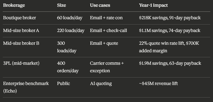 The pattern: revenue lift from faster quoting dominates for brokers under 300 loads/day; labor savings dominate above that.