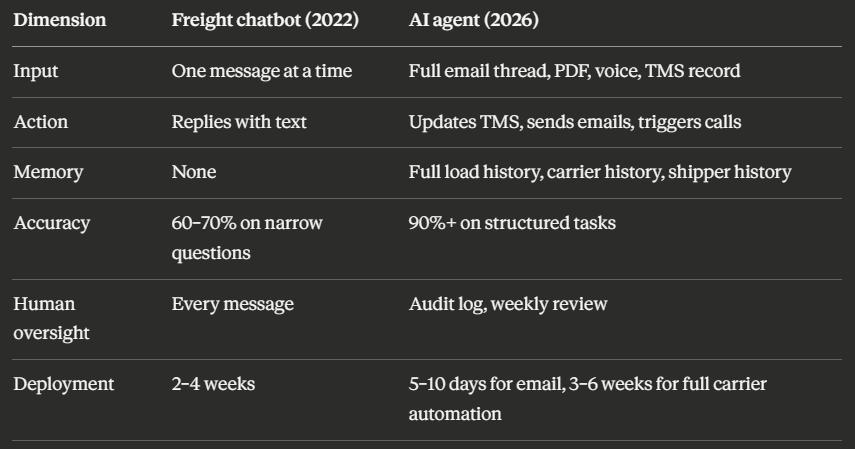 How is an AI agent different from a freight chatbot? Chatbots respond to single messages with text. Agents read full threads, act in external systems (TMS, email, calling platforms), maintain memory across loads and carriers, and measure their own outcomes.